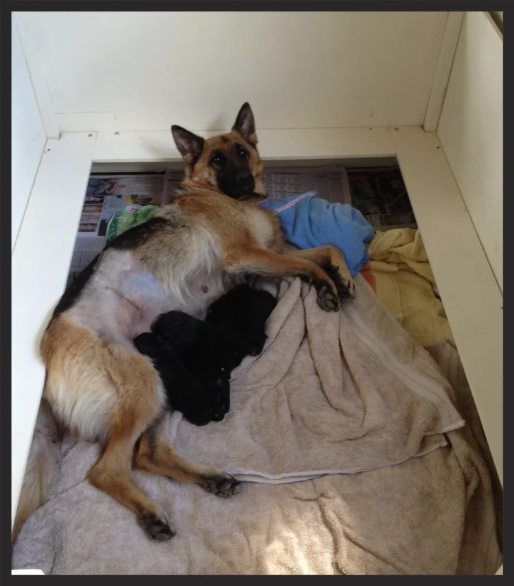 Inca went into the early stages of labour on the Wednesday night, giving it a fair go until Friday morning when pups finally came out via caesarean. All the pups are healthy and happy [and huge!]. Mum is happy learning the ropes and enjoying these strange squeaky blobs.
