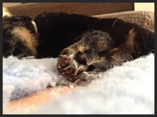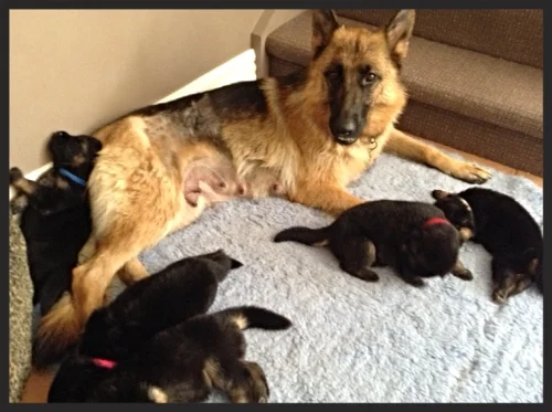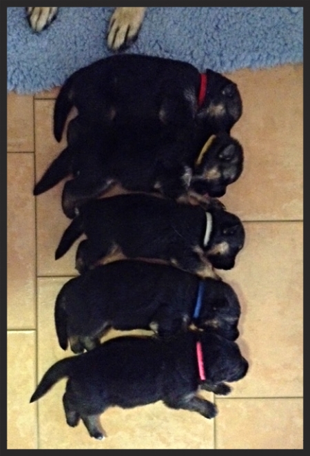 The pups and Inca are doing great. They all have their collars on now and have little nicknames. We weighed them again yesterday and all are over one kilo, the porkies!